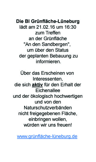 21.02.2016 | Die BI Grünfläche-Lüneburg lädt um 16:30 Uhr zum Treffen an der Grünfläche "An den Sandbergen". | Flugblatt |