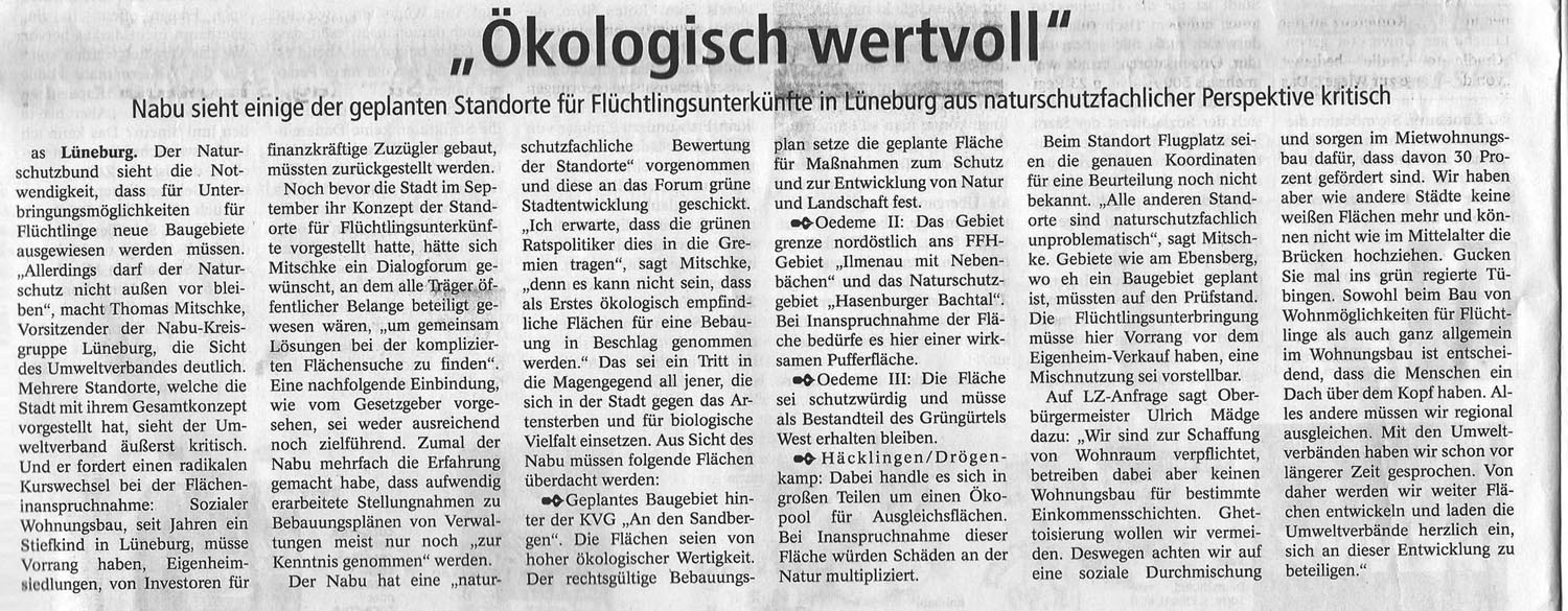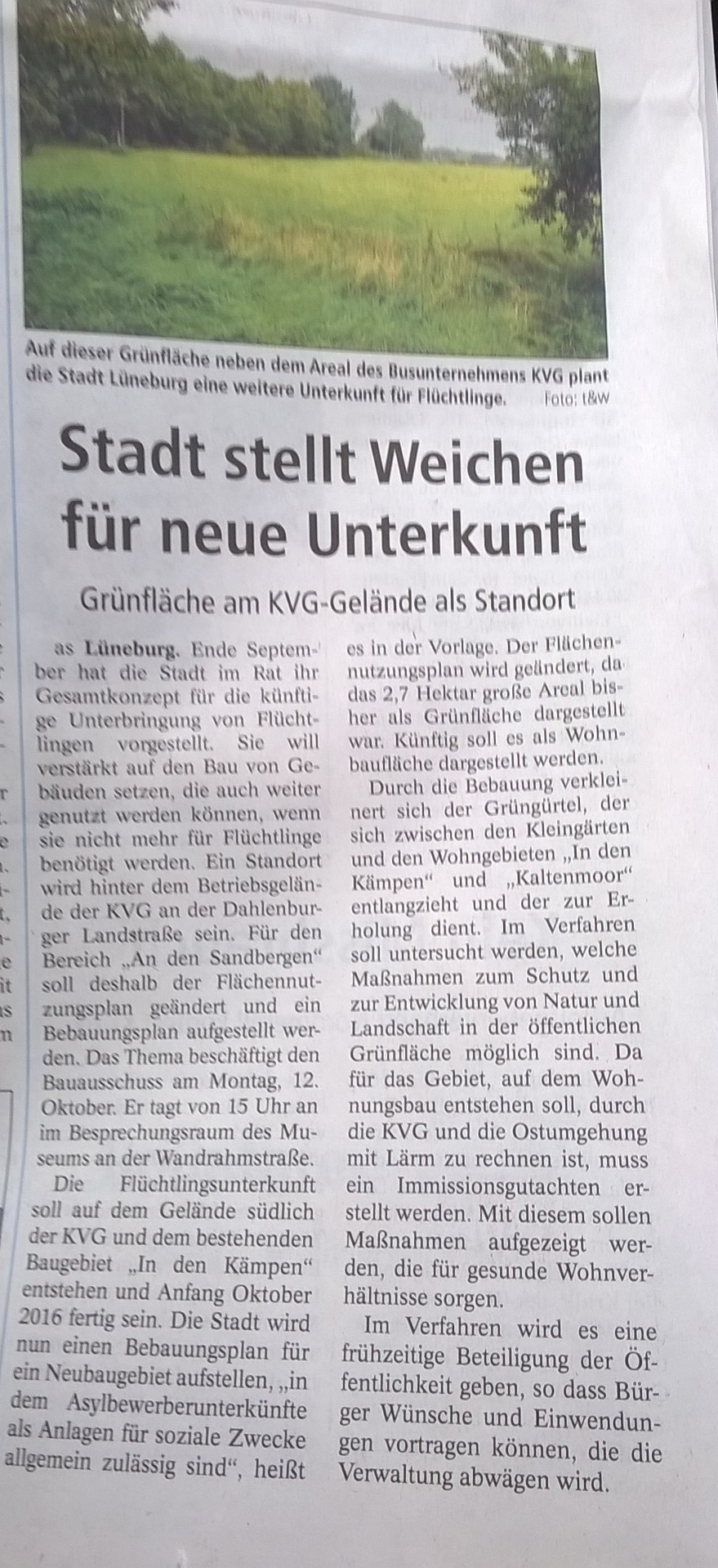 25.09.2015 | Artikel "So will Lüneburg weitere Flüchtlinge unterbringen" (Link) | Quelle: Landeszeitung für die Lüneburger Heide |